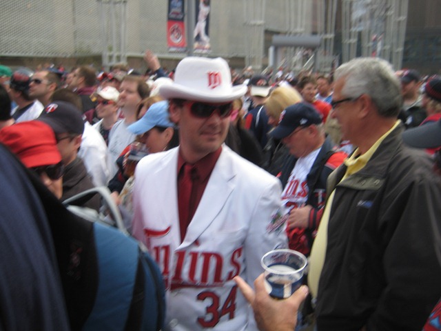 Everyone was wearing their Twins garb – usually for a Red Sox game, there’s a good 10% of the people wearing Red Sox gear – not today. In fact, this was my favorite Twins outfit – a guy I saw as a I walked in: