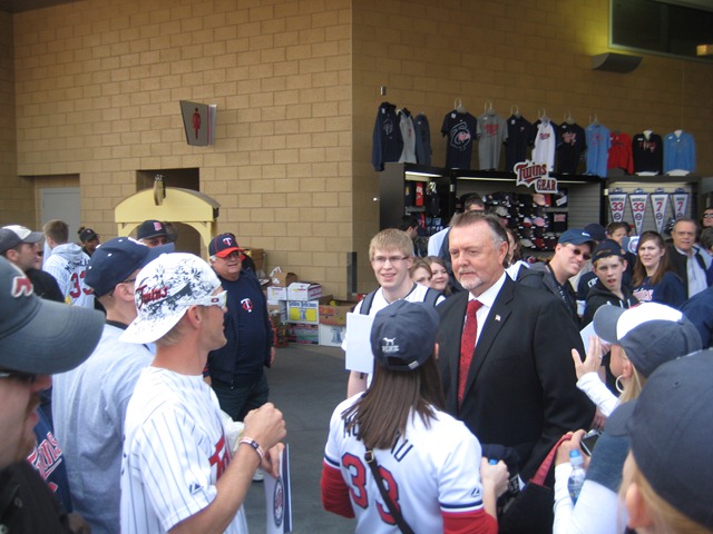 The Twins cranked out quite a few homers, including one hit two runs in front of me. It really made me mad for forgetting my glove. Delmon Young annihilated three balls into the upper deck over my head. Now I see why everyone thinks he has so much potential – if only he could do that when an opposing pitcher is on the mound. As the Twins wrapped up BP, the Red Sox made their way out to the field. Josh Beckett and John Lackey were playing catch right in front of the wall as the rest of the relievers were getting some sprints in. With all the noise and excitement of BP, I had missed a call from my brother Marc who was on his way over. I walked around the concourse the long way to go meet him over in the right field gate. Just after he came in, we ran into future Hall of Famer (and Twins announcer) Bert Blyleven: