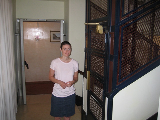 We had the camera locked up in the suitcase, so we didn’t really get any pictures besides this one of Becky’s next to our very antiquated, but cool elevator in our hotel.