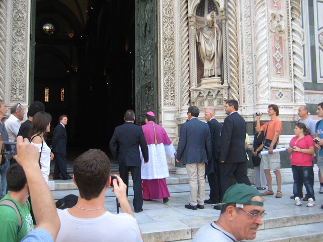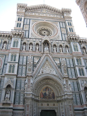 After the Gallery, we headed off to the Cathedrale di Santa Maria del Fiore which is an enormous church in the center of town. We couldn’t go in because they had mass on the Sunday, so we listened to our tour guide explain some of the history and as we were waiting outside the archbishop of Florence entered the church. We then continued down to the Palazzio Vecchio which is the seat of government for Tuscany and has been for 700 years. Outside there were many famous sculptures, including a replica of David, plus the real Hercules and Neptune sculptures. The original David used to sit in front of the palazzo but it was moved inside to keep it out of the weather. We kept going through town to the Uffizi – the famous museum and the oldest, modern museum in the world (as in a place where art was displayed but not made). We didn’t go inside but outside were small statues of many famous Italians included Michelangelo, Galileo, Amerigo Vespucci, Dante, etc. The Uffizi is situated along the river Arno, so we took a picture of the Ponte Vecchio (old bridge) which is interesting in that is has shops and apartments along the bridge. From there we went towards the Sante Croce church which houses the tombs of many leading Italians. We stopped in a shop where they told us how Italian gold (always 18k) and leather (from sheep and goats, not cows) is made. And that was the end of our tour – we were free to roam as we pleased from noon to 8pm. We were a long ways from the hotel, so we had to figure out for ourselves, how to get back.