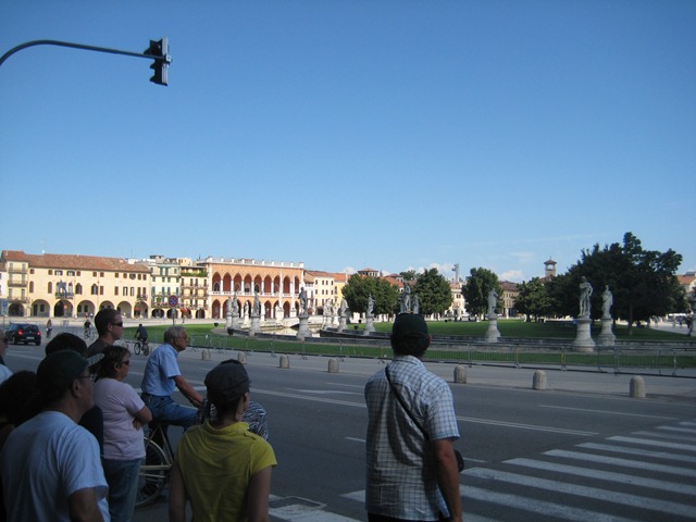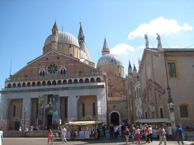 We stopped in Padua about 11am. The town square is different than the other towns we had seen – it’s very open. Padua is the home of St. Anthony, so we headed over to his colossal church complex. They had his tomb there as well as his relics which included some impressive gold chalices. After a walk through the church we had a little free time, so we walked along the quiet streets and stopped for lunch at an inexpensive place on the corner in front of the church. We had been heeding the lesson of my brothers who told me “Do Not Buy Cheap Food”. We didn’t listen this time and Becky ended up with a 2 Euro pizza which was badly microwaved and I had some lasagna that tasted okay but my stomach didn’t appreciate it for the rest of the afternoon.