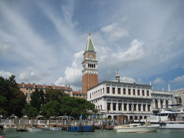I have always wanted to see Venice because there’s no other city like in the world. As you approach Venice it’s pretty industrial and not terribly impressive. We went over the bridge onto the island in the lagoon. As soon as we got there we had to disembark and give our luggage away – there were porters who took our luggage to our hotel. I asked our guide where we were staying but he just said we’ll get there at 6:15 or so after we go to St. Mark’s square and meet our local tour guide. We waited for a minute for our transportation to arrive – it was a water taxi – essentially an open speedboat. We raced down a back canal into the grand canal and then over to St. Mark’s square. Along the way, we had stopped at a rest area and we saw 5-6 other buses full of tourists headed to Venice, so I knew it was going to be busier, but it was even busier than I had expected. St. Mark’s square was packed. We made a rendez-vous with our guide, Louisa, in front of the Doge’s Palace where Venice was ruled as an independent state. The Palace was very impressive and Louisa did a good job of explaining everything to us. Venice was self-governed for 600 years – 1197-1797 and they had acquired a lot of paintings and gold which adorned the senate and judicial rooms. We walked over the “Bridge of Sighs” which leads to the prison next door. After the palace we walked over to St. Mark’s church and saw the huge line of people waiting to get in. Louisa asked us if we wanted to wait in line or pay 1 Euro to get in right away. We all agreed to pay the Euro and she ushered us through the middle doors immediately instead of waiting for 20-30 minutes otherwise. St. Mark’s tomb is inside the church along with the (what was getting customary) artwork and sculptures.