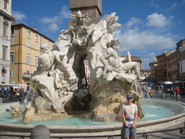 Next, we went to the Piazza Navone – a wide-open area featuring the Fountain of Four Rivers that was highlighted in Angels in Demons. It’s a Bernini fountain and it features a river from the known continents including North America, and the river they chose was the Plate river. I have no idea what the Plate River is. We admired that fountain and the other two and then proceeded north across the bridge of the river Tiber to the courts building. From the court building to the Castel San Angelo there were a ton of little shops featuring everything from electronics to records (the 78 speed type) and the staple of knick-knacks and clothes. I’d been looking to pick up a soccer jersey and finally found an XXL one that fit okay. It’s David Villa’s team Spain soccer jersey. I had to spend the better part of the evening trying to figure out who the heck that was. He is number 7, so it fits in well with my Joe Mauer collection.