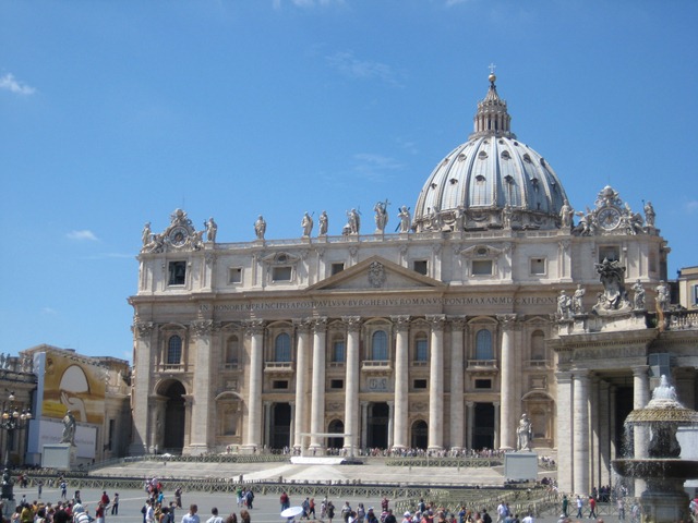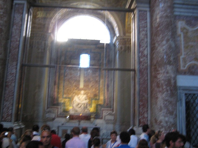 We stopped for lunch after walking around (but not into) Castel San Angelo. For something different, we tried pasta and pizza – just kidding, that’s what we had for every meal. We got to the Vatican and walked into the forum in front and figured out the line started there for entrance into the Basilica – far on the right side. The line moved fast, so it was only 10-15 minutes before we made it through the security gates. Next was the shoulder check – they looked everyone over to make sure they didn’t have exposed shoulders. We made it into the church – it’s gigantic. I didn’t see until afterwards that it can hold 60,000 people. There was Michelangelo’s Pieta on the right side as you enter. The rest of the basilica had several frescos and paintings and just in front of the alter was St. Peter’s gravesite.