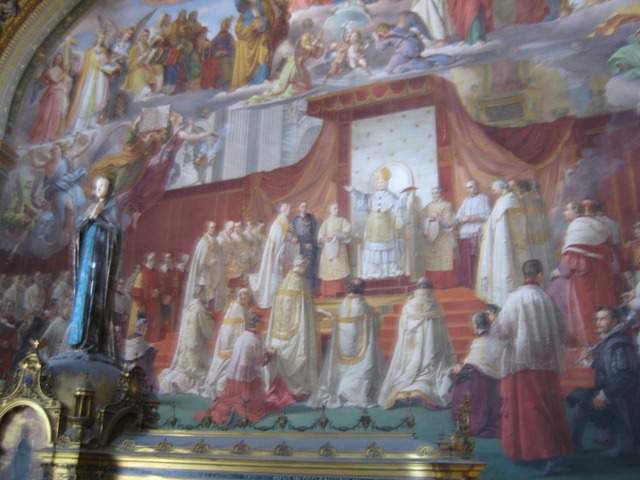 We figured there was an entrance from the basilica into the Vatican Museum since they are both in the Vatican, but things are never that simple. We had to walk all the way around to the north of the Vatican to find the entrance. we didn’t have to wait in line too long and we picked up an audio tour listening device so we could know what was going on. There were a TON of people at the museum, so going anywhere was a chore. We went through the museums of Rome and Greek, the Etruscans, the hall of maps (which I found very interesting), the apartments painted with Rafael’s frescoes and finally we got to the Sistine Chapel. There were so many people in the Chapel it took a way a little of the enjoyment of looking at the marvelous ceiling and the entire room. We spent a good chunk of time there, but it was hard to get past the guards shushing everyone and people tripping over you.